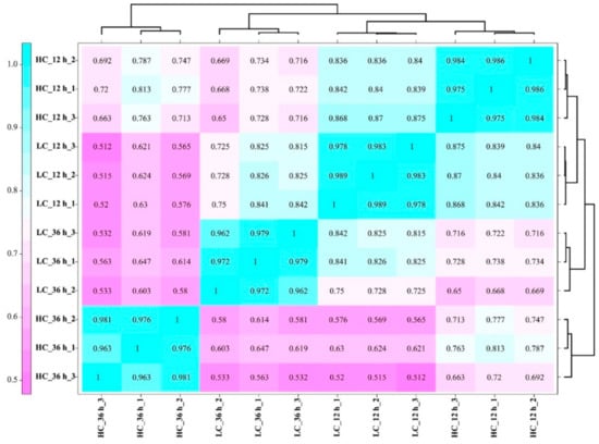Pearson correlation coefficients for pair-wise comparisons of transcriptome data. The sample names were combined with treatment_time_repeat. HC means high CO2 concentration treatment; LC means low CO2 concentration treatment.