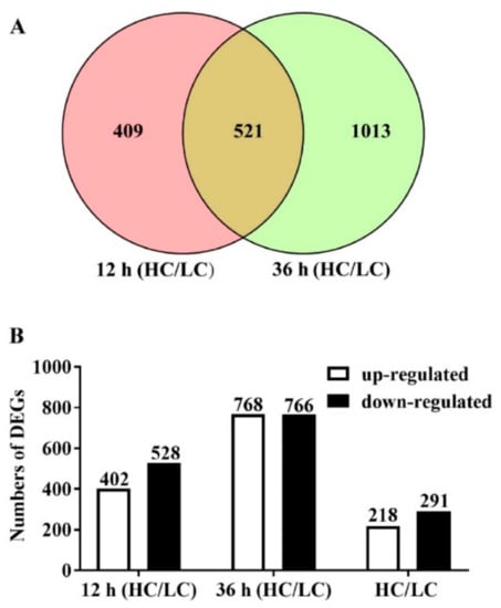 Number of differentially expressed genes (DEGs) in response to different CO2 concentrations. (A) Venn diagram showing the number of DEGs between high and low CO2 concentrations. (B) The number of up or down regulated genes following the high CO2 treatment compared with the low CO2 treatment. The number 12 (HC/LC) corresponds to the number of DEGs after 12 h of treatment, and 36 (HC/LC) corresponds to the number of DEGs after 36 h of treatment, HC/LC corresponds to the DEGs with the same expression patterns after both 12 h and 36 h of treatment. The number of DEGs is indicated on the top of the histograms.