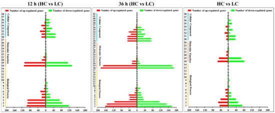 GO analysis showed that 878 DEGs (about 45.2% of total DEGs) gained GO annotation and were classified into three GO ontologies and 42 terms related to biological process, cellular components, and molecular functions (Figure 5 and Tables S3–S5). About 33 terms were enriched after 12 h of treatment, 42 terms were enriched after 36 h of treatment, and 30 terms were enriched at both time intervals. Most of the DEGs belonging to “Cellular Component” ontology showed down-regulated expression in the HC group at both 12 h and 36 h time intervals. The categories associated with the cell division process, including “cell” (GO:0005623), “cell part” (GO:0044464), “organelle” (GO:0043226), “macromolecular complex” (GO:0032991), “organelle part” (GO:0044422), and “cellular component organization or biogenesis” (GO:0071840) mainly contained down-regulated genes related to the HC treatment, suggesting a negative effect of a high CO2 concentration on pileus cell division. However, the GO categories of “localization” (GO:0051179), “transporter activity” (GO:0005215), and “nucleic acid binding transcription factor activity” (GO:0001071) chiefly contained up-regulated genes related to the HC treatment, which indicated the cell metabolism was still active under high CO2 conditions. The results also showed that the high CO2 treatment may down-regulate gene expression in the “response to stimulus” (GO:0050896) category.
