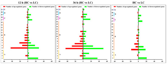 Kyoto Encyclopedia of Genes and Genomes (KEGG) classification of DEGs between high (HC) and low (LC) CO2 treatments. Different capital letters in the left of each bar chart represent the KEGG A Classes: A. Genetic Information Processing; B. Metabolism; C. Cellular Processes; D. Environmental Information Processing; E. Organismal Systems. Different numbers in the left of each bar chart represent the KEGG B Classes: 1. Folding, sorting and degradation; 2. Translation; 3. Replication and repair; 4. Transcription; 5. Global and overview maps; 6. Carbohydrate metabolism; 7. Amino acid metabolism; 8. Lipid metabolism; 9. Energy metabolism; 10. Nucleotide metabolism; 11. Metabolism of other amino acids; 12. Metabolism of cofactors and vitamins; 13. Metabolism of terpenoids and polyketides; 14. Biosynthesis of other secondary metabolites; 15. Glycan biosynthesis and metabolism; 16. Xenobiotics biodegradation and metabolism; 17. Cell growth and death; 18. Transport and catabolism; 19. Signal transduction; 20. Membrane transport; 21. Aging.