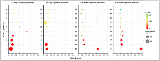 The Kyoto Encyclopedia of Genes and Genomes (KEGG) pathways of the DEGs are shown in Figure 6 and Tables S6–S8. The figure shows that 103 pathways, which can be classified into five groups and 21 subgroups, enriched 469 DEGs (about 24% of the total DEGs). The “Genetic Information Processing”, “Cellular Processes”, “Environmental Information Processing”, and “Organismal Systems” groups showed significantly higher numbers of down-regulated genes than up-regulated genes (only “translation” and “membrane” subgroups showed higher numbers of up-regulated genes). Especially, the subgroups of “Folding, sorting and degradation”, “Replication and repair”, “Cell growth and death”, and “Signal transduction” enriched more than 10 DEGs for each and almost exclusively contained down-regulated genes following both 12 h and 36 h treatments. The up-regulated genes were mainly enriched in the “Metabolism” group, especially in the “Global and overview maps”, “Carbohydrate metabolism”, and “Amino acid metabolism” subgroups. These findings correspond to GO annotation results and demonstrate that the metabolic pathways were active under high CO2 conditions.