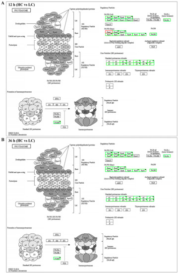 Putative pathway of proteasome in F. filiformis generated by KEGG analysis. (A) The gene expression profiles between high (HC) and low (LC) CO2 treatments at 12 h. The enzymes encoded by DEGs between HC and LC at 12 h are marked by stars. (B) The gene expression profiles between HC and LC at 36 h. The enzymes encoded by DEGs between HC and LC at 36 h are marked by stars. The boxes with a red border indicate up-regulation in the high CO2 treatment. The boxes with a green border represent down-regulation in the high CO2 treatment. The boxes with a black border mean no genes were annotated.