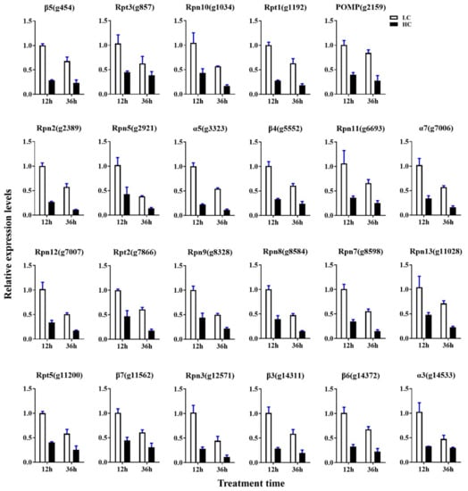 qRT-PCR analysis of DEGs in the proteasome pathway. Data are the means of three biological replicates, and the bars represent SEMs.