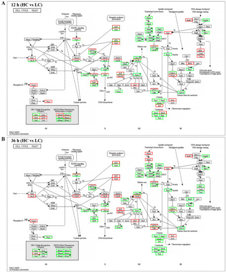 Putative pathway of cell cycle–yeast in F. filiformis generated by KEGG analysis. (A) The gene expression profiles between high (HC) and low (LC) CO2 treatments at 12 h. The enzymes encoded by DEGs between HC and LC at 12 h are marked by stars. (B) The gene expression profiles between HC and LC at 36 h. The enzymes encoded by DEGs between HC and LC at 36 h are marked by stars. The boxes with a red-border indicate up-regulation in the high CO2 treatment. The boxes with a green border represent down-regulation in the high CO2 treatment. The boxes with a black border mean no genes were annotated. The solid arrows indicate activation, the dashed arrows mean indirect effect.
