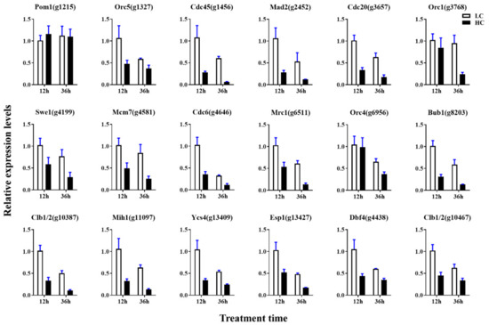For further investigation of the proteasome and cell cycle processes under different concentrations of CO2, all expressed genes were mapped into these two pathways. As shown in Figure 8A,B and Supplementary Table S10, 30 genes were mapped to 29 enzymes in the proteasome pathway, 29 genes of 28 enzymes showed lower expression levels in the HC group with both 12 h and 36 h intervals (including 16 DEGs of 12 h and 23 DEGs of 36 h), and only Rpn1 (k03028) encoding the gene g10463 showed higher expression (|log2 FC|= 0.06, FDR = 0.89) in the HC group after 12 h of treatment. The expression levels of all 23 DEGs were verified by qRT-PCR. The transcriptional levels of these genes in the LC groups were about 1.6–5.3-fold greater than in the HC groups, which was correlated with the transcriptome profiling data (Figure 9). As shown in Figure 10A,B and Supplementary Table S11, 58 enzymes of the cell cycle–yeast pathway were mapped by 72 expression genes (APC/C mapped six genes, SCF mapped four genes, Fus3 mapped three genes, and Bub1, Cdc28, Clb1/2, Grr1, PP2A, and Tup1 mapped two genes each). Among them, 10 DEGs were detected following 12 h of treatment and 17 DEGs were detected following 36 h of treatment. All of these DEGs were down-regulated in HC groups. The expression levels of all 18 DEGs were verified by qRT-PCR, and the transcriptional levels of these genes (except for g1215) in the LC groups were higher than in the HC groups, which was correlated with the transcriptome profiling data (Figure 11). The FPKM analysis showed that g1215 had low expression in all the samples and had the highest FPKM value of 1.3.