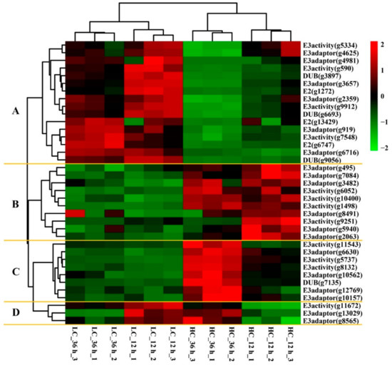The ubiquitin–proteasome system is involved in the regulation of many basic cellular processes [32]. The covalent modification of proteins with ubiquitin is necessary for a tight cell cycle and division in all eukaryotes [34]. The KEGG mapping results demonstrate that a high CO2 concentration can down-regulate gene expression of both the proteasome and cell cycle–yeast pathways, so it is necessary to investigate the expression patterns of ubiquitin-related enzyme family genes. About 230 ubiquitin-related enzyme proteins of Schizosaccharomyces pombe were downloaded from the Ubiquitin and Ubiquitin-like Conjugation Database (UUCD) [35], and local blastp results showed that 37 ubiquitin relative enzyme encoding genes were annotated from 1943 DEGs, including three E2s (ubiquitin-conjugating enzymes or ubiquitin-carrier enzymes), 30 E3s (ubiquitin ligases), and four DUBs (deubiquitinating enzymes). The heat map of gene expression patterns showed that the DEGs were clustered into four main clades (Figure 12 and Supplementary Table S12). Clade A is the biggest clade, containing three E2s, three DUBs and 10 E3s that were up regulated in LC samples and down regulated in HC samples after 36 h. These results were consistent with the expression pattern of the proteasome and cell cycle–yeast pathway genes. Clade B contained 10 E3s with elevated expression in HC groups but minimum expression in LC groups. Clade C contained seven E3s and one DUB; these genes showed maximum expression in the 36 h HC samples, followed by the 12 h HC samples, while they showed low expression in the LC samples. There were only three E3 genes in clade D and they showed higher expression in the 12 h LC and 36 h HC samples. The LC and HC samples were clustered into two different clades, and the biological repeats of each treatment were clustered together into a single subclade. These results indicate that the gene expression of ubiquitin-conjugating machinery might be regulated by different CO2 concentrations.