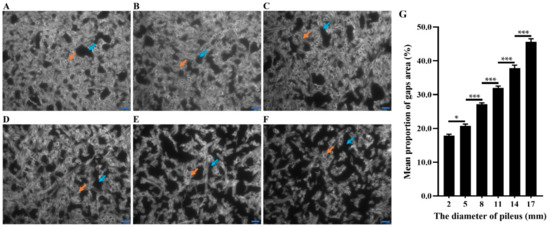 Observation of fluorescent whitening agent staining on paraffin sections of F. filiformis context cells from different diameters of the pileus: (A) 2 mm; (B) 5 mm; (C) 8 mm; (D) 11 mm; (E) 14 mm; and (F) 17 mm. The black areas indicated by the blue arrows are the gaps among hyphae. The white or gray areas indicated by the orange arrows are hyphae and hyphae transections. Bar = 20 μm. (G) The mean proportion of the gap area was quantified by image J software; data are the means of eight replicates, and the bars represent SEMs. Significant differences were analyzed using Tukey’s multiple comparisons test, * p < 0.05, *** p < 0.001.