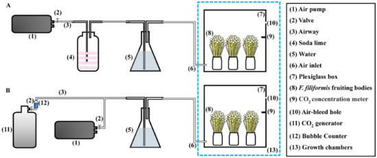 CO2 concentration controlling apparatus for the fruiting body cultivation of F. filiformis. (A) The cultivation apparatus with a low CO2 concentration. (B) The cultivation apparatus with a high CO2 concentration.