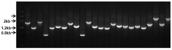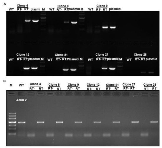 To validate this cloning and expression system, seven tea FL-cDNAs were selected (clone numbers 4, 8, 9, 12, 21, 27, and 28), as seen in Table 1, and their FL-cDNAs were recovered from their respective plasmids by Sfi I digestion, ligated into pBIG2113SF–M vector, and transformed into Arabidopsis. RT-PCR analysis of transgenic plants demonstrated that all seven tea genes were successfully transformed and expressed in Arabidopsis, as seen in Figure 3.