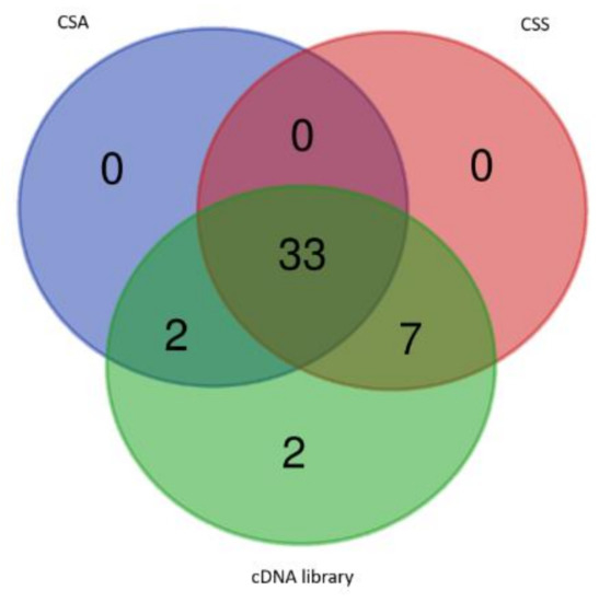 These 44 FL-cDNA sequences were used to query the CSS and CSA database, respectively. Thirty-three cDNAs were commonly detected in both databases; seven cDNAs (MK795747, MK795755, MK795757, MK795761, MK795762, MK795764, and MK889354) were found from CSS database but not from CSA database; two cDNAs (MN102719 and MK795766) were found from CSA only. The other two cDNAs, one encoding a natural antisense transcript (clone 34), and the other one encoding a putative long chain noncoding RNA (clone number 43), were not found from CSS and CSA databases, as seen in Figure 2. These observations demonstrated that this normalized tea FL-cDNA library can complement the existing tea genome databases, and identify rare protein coding cDNAs, noncoding RNAs, or natural antisense transcripts. In addition, once this library was extensively sequenced, these sequences’ information can be used to improve the prediction of tea genetic structures.