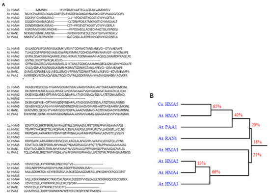 Sequence comparison of CsHMA5 and Arabidopsis orthologs. (A) Protein sequence alignment of CsHMA5 with Arabidopsis orthologs HMA1 (At4g37270), HMA2 (At4g30110), HMA3 (At4g30120), HMA4 (At2g19110), HMA5 (At1g63440), RAN1 (At5g44790), and PAA1 (At4g33520). (B) Phylogenetic tree of the amino acid sequence of CsHMA5 and the seven Arabidopsis HMA protein sequences.
