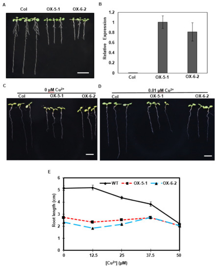 Overexpression of CsHMA5 in Arabidopsis reduced copper sensitivity. (A) CsHMA5 overexpressors showed short roots on standard 0.5× MS medium. (B) RT-qPCR analysis of the expression levels of control and two CsHMA5 overexpressors. (C,D) Col and two CsHMA5 overexpressors (OX-5-1 and OX-6-2) were germinated on synthetic 1× MS medium without copper or low copper concentration (0.01 µM). (E) Col and two CsHMA5 overexpressors (OX-5-1 and OX-6-2) were germinated on standard 0.5× MS medium supplemented with 12.5–50 µM copper. The seeds were germinated vertically under continuous light, the root lengths were measured from 10-day-old seedlings. Data are expressed as mean ± SE (n = 28). Scale Bar = 1 cm.