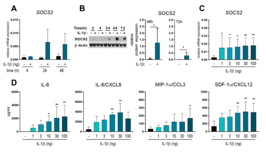 To investigate whether SOCS2 might act as a negative feedback inhibitor of IL-1β signaling, we first monitored the ability of IL-1β to trigger SOCS2 expression. To do this, we analyzed SOCS2 mRNA as well as protein expression upon IL-1β stimulation in monocyte-derived DCs (moDCs) at several time points (Figure 1A,B). As previously observed for LPS-induced SOCS2 [19], IL-1β-induced SOCS2 mRNA expression is first detectable at 24 and 48 h post-stimulation (Figure 1A). Accordingly, we observed significantly enhanced SOCS2 protein levels at both those time points, peaking at 48 h post IL-1β stimulation; by 72 h, SOCS2 protein was clearly diminished (Figure 1B). We also investigated the dependence of SOCS2 expression on the concentration of IL-1β. Interestingly, we identified a significant increase in the level of SOCS2 mRNA even after stimulation with a low amount (1 ng/mL) of IL-1β, and this level of expression was not further enhanced by treatment with higher concentrations of IL-1β (Figure 1C). In contrast, the IL-1β-mediated secretion of pro-inflammatory cytokines and chemokines showed a concentration-dependent increase (Figure 1D). These data reveal that IL-1β is a potent inducer of both SOCS2 mRNA and protein expression in human moDCs.