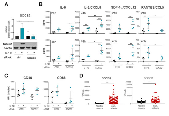 Additionally, we found that SOCS2 was differentially expressed in AML and CML patients compared to healthy subjects. It has been reported for CML that SOCS2 is overexpressed in advanced tumor stages and that SOCS2 expression is dependent on the Bcr-Abl mutation [26]. Moreover, SOCS2 has been described as one of four elements of a prognostic gene signature associated with AML, and a study on pediatric AML showed that high levels of SOCS2 correlate with poorer overall survival. In accordance, high SOCS2 expression was suggested to promote disease aggressiveness in AML patients [27,28]. Further investigations by Kazi et al. on the mechanism by which SOCS2 might support AML progression suggest that SOCS2 inhibits FLT3 signaling in AML by blocking Erk and STAT5 [29]. Interestingly, Radich and colleagues identified SOCS2 and IL-8 among the top ten genes associated with CML disease progression. However, they reported an inverse correlation of SOCS2 and IL-8, as they showed that SOCS2 is up-regulated whereas IL-8 is down-regulated in advanced CML compared to the chronic phase [30]. A recent study suggests that IL-8 as well as RANTES may also be valuable predictive markers in AML. The latter study reports that high serum IL-8 and low RANTES levels are correlated with a more favorable prognosis and may also be associated with a higher probability for AML patients to respond to immunotherapy [31]. In accordance, we detected significantly increased secretion of IL-8, but decreased RANTES expression in SOCS2-silenced, IL-1β-stimulated DCs. These studies clearly show that dysregulated SOCS2 expression can modulate the secretion of specific cytokines and is associated with leukemia; however, more studies are needed to fully understand the regulation and function of SOCS2 in leukemic cells. In addition, SOCS2 has also been identified to play a role in other cancer types such as melanoma, where specific loss of SOCS2 in DCs enhanced anti-tumoral immunity in a melanoma mouse model [32].