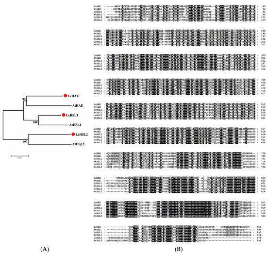 Sequence and phylogenetic analysis of LcHSLs protein. (A) Phylogenetic relationships of LcHSLs with Arabidopsis AtHAE, AtHSL1, and AtHSL2. LcHAE (ID number: LITCHI029130.m1), LcHSL1 (ID number: LITCHI029130.m1), and LcHSL2 (ID number: LITCHI007137.m1) are indicated by red circles. The maximum likelihood phylogenetic tree was created using MEGA program (version 5.0). (B) Multiple alignment of LcHAE, LcHSL1, and LcHSL2 with AtHAE, AtHSL1, and AtHSL2.
