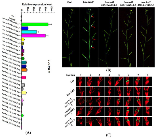 To test whether LcHAE, LcHSL1, and LcHSL2 have functions in the regulation of abscission, wild type Arabidopsis plants were transformed with a construct driving LcHAE, LcHSL1, and LcHSL2, respectively, by the strong constitutive cauliflower mosaic virus 35S promoter. More than 20 transgenic lines expressing each gene were generated. However, there were no visible phenotypic changes observed when compared to wild type Arabidopsis. Next, we investigated whether LcHAE, LcHSL1, and LcHSL2 had a conserved function to HAE/HSL2 in regulation of floral abscission in Arabidopsis. The hae hsl2 mutant plants were transformed with each construct as mentioned above. We also generated more than 20 transgenic lines expressing each gene. For all the transgenic lines expressing LcHAE or LcHSL1 in hae hsl2 background, the floral organs remained attached, which was the same as that in the hae hsl2 mutants. Interestingly, we found that 20 out of 29 T1 transgenic lines expressing LcHSL2 showed wild type abscission patterns (three representative transgenic lines were shown here, Figure 2A,B). Previous studies have demonstrated that organ abscission is closely associated with an increase in cytosolic pH in AZ cells, which can be easily detected by BCECF-AM staining [23]. Therefore, we performed BCECF assays using three representative lines, hae hsl2 35S:LcHSL2-1, hae hsl2 35S:LcHSL2-3, and hae hsl2 35S:LcHSL2-4, which displayed a relatively higher expression level of LcHSL2 in hae hsl2 background (Figure 2A). In wild-type Col, the BCECF signals in the floral AZ appeared starting from position five and went through position eight, while the BCECF signals disappeared in the floral AZ of hae hsl2 mutants, which is consistent with floral organ abscission deficiency of hae hsl2. When LcHSL2 was expressed in hae hsl2 mutants, the BCECF signals appeared again and showed a similar pattern to that in Col (Figure 2C). These findings indicate that the presence of LcHSL2 was sufficient to induce the floral organ abscission in hae hsl2 mutant plants. Thus, LcHSL2 was selected for further analysis.