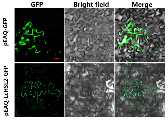 Subcellular localization assay of LcHSL2 in epidermal cells of tobacco leaves. GFP signals were observed with a fluorescence microscope after 48 h of infiltration. Bars = 25 μm.