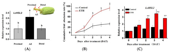 To test the involvement of LcHSL2 in the fruitlet abscission of litchi, we examined the expression profile of LcHSL2 in three regions of the pedicel: The fruit AZ, the distal region (between the fruitlet and the fruit AZ), and the proximal region (Figure 5A). LcHSL2 was expressed significantly higher in the fruit AZ than those in the adjacent tissues (Figure 5A).