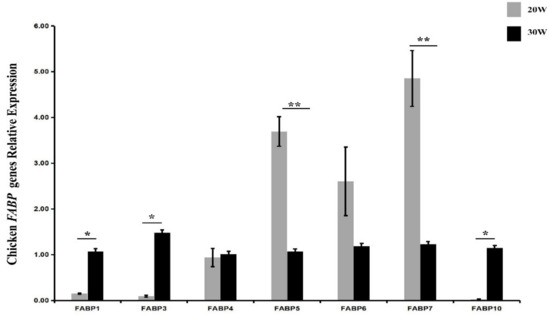 The dynamic expression profiles of FABP genes in the liver were investigated by qPCR. The results showed different expression trends in the livers of pre-laying hens (20 weeks old) and peak-laying hens (30 weeks old). The expression levels of FABP1, FABP3, and FABP10 increased with sexual maturation, while the expression levels of FABP5 and FABP7 significantly decreased, and FABP2, FABP4, and FABP6 showed no changes (Figure 4).