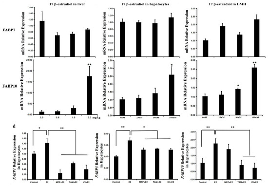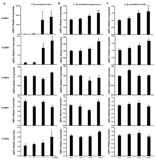 To verify the effect of estrogenon the transcriptional regulation of FABP genes in vivo, the expression levels of FABP genes in the liver of chickens treated with 17β-estradiol were analyzed using qPCR. The results show that the mRNA levels of FABP1, FABP3, and FABP10 were significantly up-regulated in the liver of treated groups in comparison to that in the control group (Figure 5a). This result was further confirmed in chicken primary hepatocytes and LMH cells treated with 17β-estradiol (Figure 5b,c). The transcriptional levels of the other FABP genes were unchanged under 17β-estradiol treatment.