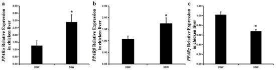 The expression profiles of chicken PPARα, PPARβ, and PPARγ genes in chicken livers between 20 and 30 weeks. Each value is represented the mean ± SE (n = 8). Student’s t-test was used to determine the statistical significance. * p < 0.05.