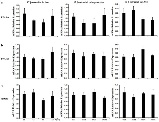 To decipher the effects of 17β-estradiol on the mRNA expression of PPAR isoforms, RT-qPCR was performed to detect the expression of PPAR isoforms in estrogen-treated livers, hepatocyte, and LMH cell models. The results show that 17β-estradiol did not affect the mRNA levels of PPAR isoforms in vivo (Figure 7a) or in vitro (Figure 7b,c), indicating that individual PPAR isoforms exert their functions independent of estrogen.
