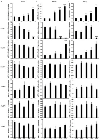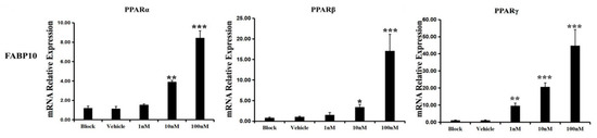 When the LMH cells were treated with different doses of the PPARα agonists WY14, 643 for 24 h, the expression level of acyl-coenzyme A oxidase 1 (ACOX1) was significantly increased, which showed a positive response to WY14,643 treatment [50] (Figure 8a). The mRNA levels of FABP1 were significantly decreased, whereas FABP10 appeared to have the reverse trend (Figure 8a). The transcriptional levels of the other FABP genes were unchanged under WY14,643.