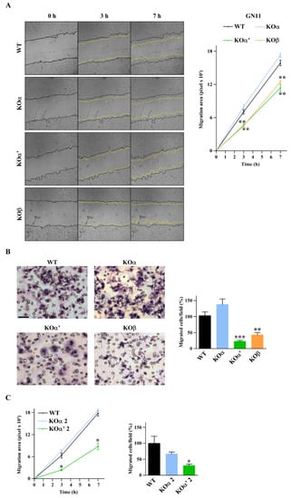 Migration properties of the different CK2 subunit-specific KO cell lines were first tested by an in vitro scratch assay, by measuring the surface occupied by wild type and CK2 KO cells after 3 and 7 h from the scratch. As shown in Figure 3A, the absence of CK2α did not significantly affect cell migration. On the contrary, the lack of either CK2α’ or CK2β significantly delayed wound closure (Figure 3A). Boyden assays were then performed to evaluate whether chemotaxis was also impaired. As shown in Figure 3B, KOα’ and KOβ cells migrated significantly less as compared to WT GN11 cells, while the ablation of CK2α did not affect the chemomigration of GN11 cells.