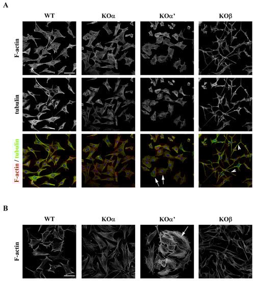 To compare the effects of CK2 inactivation on cell morphology, we studied the cytoskeleton organization of each KO cell line, by performing immunostainings for F-actin and α-tubulin. As shown in Figure 4A, KOα cells appeared similar to WT cells while KOα’ were flatter and less elongated compared to WT cells. In contrast, KOβ cells displayed a smaller cellular body and their axons appeared longer, compared to WT cells. No gross differences were observed in α-tubulin organization between the different genotypes, whereas differences in actin organization were found (Figure 4B). KOα’ cells displayed a larger number of actin stress fibers compared to WT cells while the KOα cells showed an actin organization comparable to WT cells (Figure 4B). KOβ cells did not exhibit proper actin fibers, with a punctate aspect typical of depolymerized actin [,]. These results suggest that the inability of KOβ cells to migrate is attributable to severe defects in actin cytoskeletal structures that are required for proper migration []. Further, the increased number of stress fibers and surface observed in KOα’ cells may be related to increased adhesion [,].