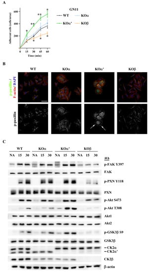 A reduced cell motility is generally correlated with reduced adhesion turnover [,]. Thus, to verify this hypothesis, we first compared cell adhesion properties of the different cell lines and then we studied the activation of specific adhesion signaling pathways. As shown in Figure 5A, KOα’ cells were more adherent compared to the wild type counterpart after just 15 min of exposure to fibronectin (FN), while KOα cells were similar to WT cells. On the contrary, KOβ cells were less adherent than WT (Figure 5A), consistent with the severe cytoskeleton defects displayed by these cells (Figure 4).