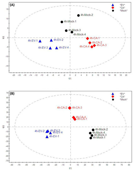 Partial least squares discriminant analysis (PLS-DA) score plots in the (A) negative and (B) positive modes showing the distribution of lipids in RD cells infected with EV-A71, CV-A16, or mock infection. Abbreviations: CA, CV-A16-infected cells; EV, EV-A71-infected cells; Mock, mock-infected cells; 4h, 4 hours post-infection.