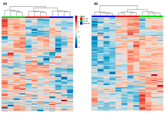 Hierarchical clustering analysis generated by MetaboAnalyst based on the all lipid features list in the (A) negative and (B) positive modes. Each bar represented a lipid feature colored in its average intensity on a normalized scale from blue (decreased) to red (increased). The dendrograms at the top were constructed based on the lipid intensity (similarity measure using Euclidean and Ward clustering algorithm). Abbreviations: CA-4h, CV-A16-infected samples harvested at 4 hours post-infection; EV-4h, EV-A71-infected samples harvested at 4 hours post-infection; Mock-4h, mock-infected samples harvested at 4 hours post-infection.