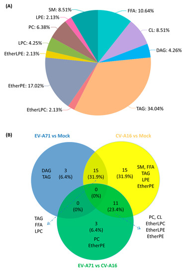 (A) Pie chart showing the 11 lipid classes of the 47 significantly changed lipids upon enterovirus infection. (B) Venn diagram demonstrating the distribution of the significantly changed lipids in the group-to-group comparison. Abbreviations: CL, cardiolipin; DAG, diacylglycerol; EtherLPC, ether-linked lysophosphatidylcholine; EtherLPE, ether-linked lysophosphatidylethanolamine; EtherPE, ether-linked phosphatidylethanolamine; FFA, free fatty acids; LPC, lysophosphatidylcholine; LPE, lysophosphatidylethanolamine; PC, phosphatidylcholine; SM, sphingomyelin; TAG, triacylglycerol.