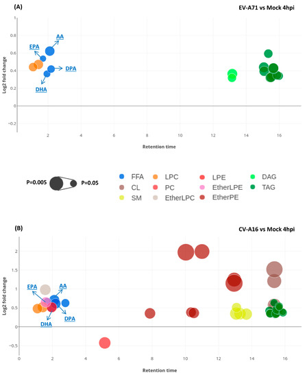 Bubble plots showing the relevant information of the significantly perturbed lipids in (A) EV-A71-infected vs. mock-infected cells and (B) CV-A16-infected vs. mock-infected cells, respectively. The X-axis is the retention time of lipids in chromatography separation. The Y-axis is the log2 fold change in abundance of each lipid in virus-infected cells relative to mock-infected cells. The size of each bubble represents the statistical significance of that change (p value by Student t-test: The larger the size, the smaller the p value). Abbreviations: AA, arachidonic acid; CL, cardiolipin; DAG, diacylglycerol; DHA, docosahexaenoic acid; DPA, docosapentaenoic acid; EPA, eicosapentaenoic acid; EtherLPC, ether-linked lysophosphatidylcholine; EtherLPE, ether-linked lysophosphatidylethanolamine; EtherPE, ether-linked phosphatidylethanolamine; FFA, free fatty acids; hpi, hours post-infection; LPC, lysophosphatidylcholine; LPE, lysophosphatidylethanolamine; PC, phosphatidylcholine; SM, sphingomyelin; TAG, triacylglycerol.
