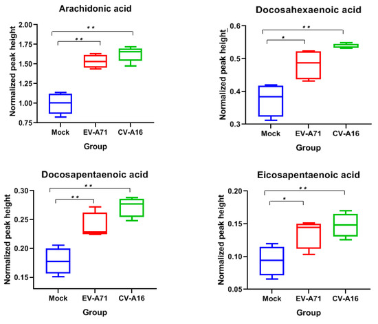 Box-whisker plots of the four fatty acid classes that were significantly upregulated in both EV-A71 and CV-A16-infected RD cells. The normalized peak heights were generated by LC-MS raw data after DNA normalization. Abbreviations: CV-A16, CV-A16-infected cells; EV-A71, EV-A71-infected cells; hpi, hours post-infection; Mock, mock-infect cells. * represented p < 0.05 and ** represented p < 0.01 (Student’s t-test).
