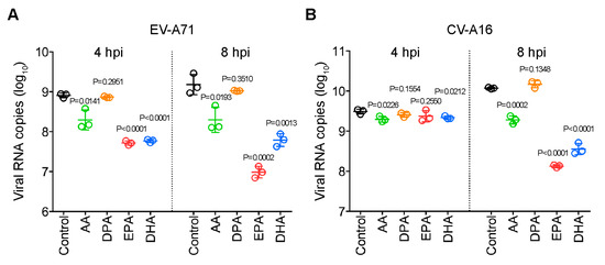 Lipid treatments of virus-infected cells were performed, as previously described, with modifications [13]. Briefly, RD cells were seeded into 96-well plates to reach 90% confluency for infection. The cells were pre-incubated with lipid-supplemented medium at the following concentrations for 2 h: AA and DPA = 100 µM, DHA = 50 µM, and EPA = 60 µM. Then, the cells were infected with either EV-A71 or CV-A16 (multiplicity of infection, MOI = 10.0). At 1 hpi, the cells were washed three times with DMEM. The cells were replenished with lipid-supplemented medium for 4 h of incubation. The cell lysates were then collected for qRT-PCR.