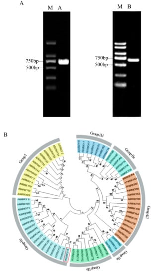 P. lactiflora cDNA was used as a template to design specific primers for open reading frame (ORF) amplification. The results showed that the PlWRKY13 ORF was 693 bp long and encoded 230 amino acids. Then, total DNA of P. lactiflora was used as a template for PCR amplification to obtain the DNA sequence of PlWRKY13 from the start codon to the stop codon. DNAMAN 5.0 software was used to compare DNA sequences with cDNA sequences, and it was determined that the sequence alignment results for PlWRKY13 were consistent, that is, there were no introns (Figure 1A). According to the classification standard of Arabidopsis WRKYs by Eulgem et al. [], the WRKY family type to which the PlWRKY13 belongs was determined, and the phylogenetic tree of PlWRKY13 and Arabidopsis WRKY family genes was constructed for phylogenetic analysis and clustering (Figure 1B). The results showed that PlWRKY13 and AtWRKY13 were a branch of the type IIc subgroup of the WRKY family.