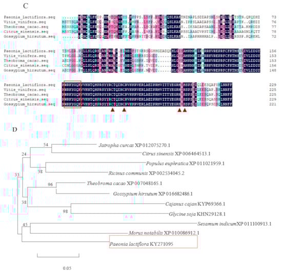 Multiple comparative analyses showed that the coding region of the PlWRKY13 gene contained a WRKY domain composed of 58 amino acids (position 152-209) and had high homology with the conserved domain of WRKY13 transcription factors cloned from other plants. The N-terminus of its conserved domain contains the highly conserved WRKYGQK heptapeptide sequence, and the C-terminus has a C2H2 (CX5CX23HNH) zinc finger structure (Figure 1C). To understand the relationship further between the PlWRKY13 protein and the WRKY13 proteins of other plant species, WRKY13 amino acid sequences from 10 plant species that were highly homologous (>50%) to PlWRKY13 were selected and constructed into an evolutionary tree. The results showed that, among the 11 WRKY13 proteins analysed (Figure 1D), P. lactiflora PlWRKY13 was most closely related to Morus notabilis MnWRKY13, and was classified into one branch. Subsequently, this branch was closely related to Sesamum indicum SiWRKY13, and both were classified into a branch. Jatropha curcas JcWRKY13, Citrus sinensis CsWRKY13, Populus euphratica PeWRKY13 and Ricinus communis RcWRKY13 were classified as one branch, and Theobroma cacao TcWRKY13, Gossypium hirsutum GhWRKY13, Cajanus cajan CcWRKY13 and Glycine soja GsWRKY13 were classified as one branch; these two branches were classified as one branch, which was distantly related to P. lactiflora.
