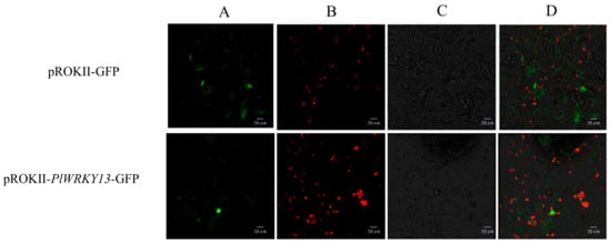 Full-length cDNA with the termination codon removed from PlWRKY13 was used as a template, and specific primers with restriction sites (XbaI and KpnI) were designed for PCR amplification (Table 1). After enzyme digestion, the obtained product was ligated to the pROKII-GFP vector that was also double digested, and the fusion expression vector pROKII-PlWRKY13-GFP was verified by sequencing. The recombinant vector (pROKII-PlWRKY13-GFP) and control vector (pROKII-GFP) were introduced into tobacco leaves through Agrobacterium infection. After culture for 3 days, the GFP fluorescence of samples was observed under a Nikon C2-ER confocal laser scanning microscope (Nikon, Tokyo, Japan).
