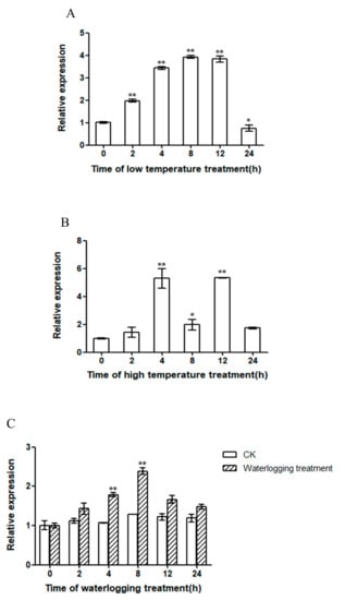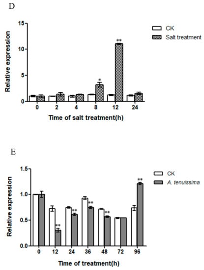 Expression patterns of PlWRKY13. (A) Low temperature stress. (B) High temperature stress. (C) Waterlogging stress. (D) Salt stress. (E) Infection with A. tenuissima. * indicates a significant difference between the treatment and control (0.01 < p < 0.05); ** means an extremely significant difference (p < 0.01).