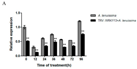 The pTRV1, pTRV2 and pTRV2-WRKY13 plasmids were transformed into A. tumefaciens GV3101 competent cells by freeze-thaw method. A total of 1 mL of A. tumefaciens GV3101-pTRV1, GV3101-pTRV2 and GV3101-pTRV2-WRKY13 was cultured in 10 mL yeast extract peptone sucrose (YEP) liquid medium (including Kan 50 μg/mL and Rif 100 μg/mL) at 28 °C for 24 h at 200 r·min−1. After that, 10 mL of bacterial liquid was transferred to 400 mL YEP liquid medium (including Kan 50 μg/mL, Rif 100 μg/mL and acetosyringone (AS) 200 μM), and cultured at 28 °C for 5–6 days at 200 r·min−1. When the OD600 of the bacterial liquid was approximately 1.5, the bacteria were centrifuged at 4 °C and 12000 r·min−1 for 2 min, collected, and suspended in solution (MES 10 mmol/L, MgCl2 10 mmol/L, AS 150 uM and aseptic water as the solvent), and the concentration of the suspension was adjusted to approximately 1.5. GV3101-pTRV2 and GV3101-pTRV2-WRKY13 were mixed with GV3101-pTRV1 in a 1:1 ratio and placed at rest for 3–5 h at room temperature in darkness [].