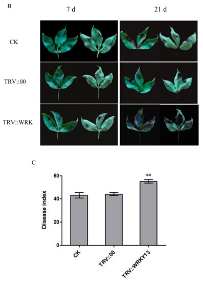 There are few studies on the functions of the WRKY family in peony. In this experiment, we have tried various methods for silencing peony PlWRKY13, and finally adopted the vacuum suction filtration under negative pressure method with the highest silencing efficiency. As a convenient technique to explore gene function widely used in recent years, VIGS is more intuitive in phenotypic variation, especially applicable to species with unstable genetic transformation system, such as grapevine [], citrus [], tomato [], gladiolus [], etc. However, the use of VIGS still has some disadvantages, including the limited duration of silence, different viral vectors will produce different silence efficiency for different species []. In our study, we used VIGS technology to preliminarily explore the function and regulatory role of PlWRKY13 in response to A. tenuissima, and its specific mechanism still needs to be further explored.