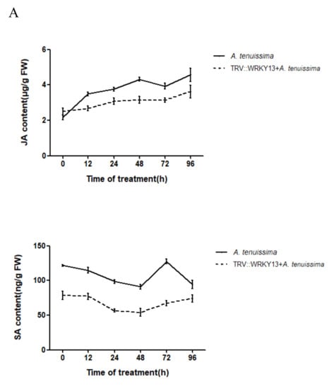To investigate the response of endogenous hormones in the leaves of P. lactiflora to pathogen infection and the relationship between PlWRKY13 and endogenous hormones, the contents of endogenous JA and SA in the leaves at 0, 12, 24, 48, 72 and 96 h after infection with A. tenuissima were detected in this study. The results showed that the JA content generally increased from 0 h to 96 h after infection, reaching a peak at 96 h, while the SA content decreased from 0 h to 48 h, then increased, peaked at 72 h, and decreased to below the initial level. The change in JA and SA in response to pathogen infection in PlWRKY13-silenced plants was basically the same as that in the control plants, except that the overall content of these two hormones in the silenced plants was lower than that in the control plants (Figure 6A). These results showed that JA and SA in P. lactiflora were closely related to the disease-resistance process and were correlated with the transcription level of PlWRKY13. The silencing of PlWRKY13 may inhibit the disease-resistance regulation pathway mediated by JA and SA.