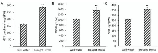 Analysis of GST (A), POD (B), and SOD (C) activities in maize seedlings under drought stress. Data are the means ± SD calculated from four replicates. Statistical significance was determined by a two-sided t-test: * p < 0.05 and ** p < 0.01.