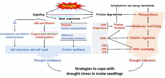 A summary of various pathways in maize seedlings in response to drought stress. Drought stress activates several signaling to regulates some gene expression, and enhances ROS scavenging, osmotic regulation, protein turnover, membrane trafficking, and photosynthesis, which improves drought tolerance of maize seedlings. Besides, drought stress inhibits some protein synthesis as well as the cytoskeleton and cell division to avoid excessive water loss. Importantly, maize seedlings enable a complex set of strategies to cope with drought stress.