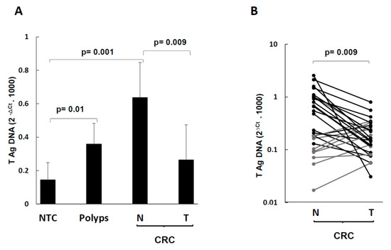 Levels of T-antigen (T-Ag) DNA in NTC, polyps, and CRC tumor and normal surrounding tissues. (A) Mean values of JCV T-Ag DNA copies in NTC, polyps, and CRC tumor (T) and normal (N) surrounding tissues; (B) individual values of JCV T-Ag DNA copies of paired tumor (T) and normal (N) surrounding tissues in CRC cases. Data are expressed according to the 2−∆Ct method [39]. The statistical significance was determined by the two-tailed Student’s t-test.