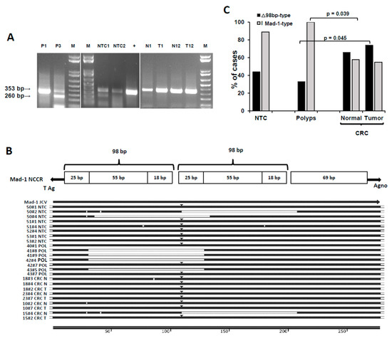 - Ricciardiello, L.; Chang, D.K.; Laghi, L.; Goel, A.; Chang, C.L.; Boland, C.R. Mad-1 Is the Exclusive JC Virus Strain Present in the Human Colon, and Its Transcriptional Control Region Has a Deleted 98-Base-Pair Sequence in Colon Cancer Tissues. J. Virol. 2001, 75, 1996–2001. [Google Scholar] [CrossRef] [PubMed]