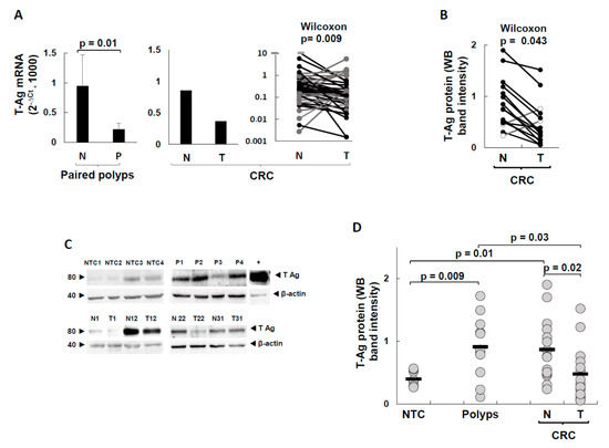 T-Ag expression in NTC, polyps, and CRC pairs. (A) Levels of T-Ag transcripts in paired adenomatous polyps and CRC cases. (B) Levels of T-Ag protein in CRC for each patient. The gray lines indicate the two samples with higher levels in the lesion than in normal tissue. (C) Western blotting of representative samples from non-tumor controls (NTC), polyps (P), and CRC normal (N) and tumor (T) tissues. (D) Arbitrary quantification of the intensity of relevant bands in western blotting for each sample of NTC, polyps, and CRC. The levels of T-Ag transcripts were expressed according to the 2−∆Ct method [39]. The statistical significance was determined by the two-tailed Student’s t-test in (A) and (D), and by the Wilcoxon signed rank test for paired samples in (B).