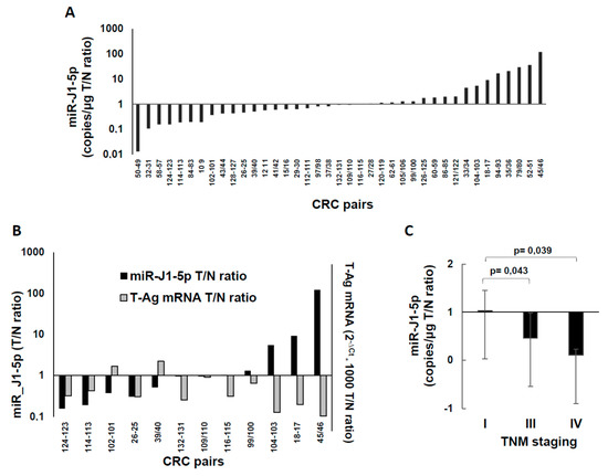 The miR-J1-5p were analyzed on 39 CRC pairs (Figure 4). In Figure 4A, the data are expressed as tumor/normal 2−∆Ct ratio, showing that 44% of the CRC lesions expressed lower miR-J1-5p than the normal mucosa from the same patient, whereas 36% of the pairs showed the opposite; 20% of the pairs had minor variations. Some of the samples had enough material to be analyzed also for T-Ag expression by western blotting, and could allow the comparison of miR-J1-5p levels to those of the T-Ag protein, as an inverse relationship between T-Ag protein expression and miR-J1-5p occurs during JCV replication [37]. However, only 50% of CRC cases presented this inverse relationship (Figure 4B). When miR-J1-5p data were compared to T-Ag RNA, DNA, and clinical data, only the correlation with TNM (tumor-node-metastases) staging emerged—the miR-J1-5p tumor/normal ratio decreased with the CRC progression (Figure 4C).