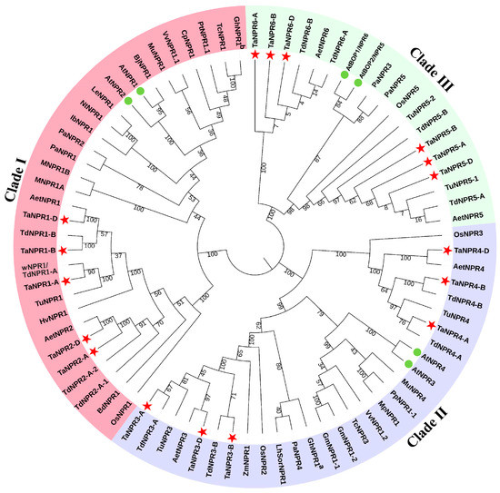 Utilizing bioinformatics tools that contain BLAST search and HMMER analysis, a total of 40 putative NPR1-like genes were identified from bread wheat and its relatives’ genomes. Among them, there were 17 in T. aestivum, five in T. urartu, 12 in T. dicoccoides, and six in Ae. tauschii (Table 1). To study the phylogeny of the NPR1-like family, an unrooted phylogenetic tree was constructed using the sequences of the 40 NPRs, and 4 OsNPRs, 5 PaNPRs, and 31 NPRs obtained through molecular cloning techniques from eight monocots and 15 dicots in the published literature (Table S1). Although individual phylogenetic analysis does not adequately perform functional annotation, phylogenetic grouping perhaps provides a reference for understanding functional diversification of the NPR1-like family. The results demonstrated that NPR1-like proteins were clustered into three major clades: clade I (AtNPR1/2 subfamily) containing OsNPR1 [50,51,52], BjNPR1 [53], MuNPR1 [54], HvNPR1 [55,56], and NtNPR1 [57], etc; clade II (AtNPR3/4 subfamily) containing OsNPR2 [51], OsNPR3 [59], TcNPR3 [60,61], and MuNPR4 [54], etc; and clade III (AtBOP1/2 subfamily) (Figure 1). In tetraploid and hexaploid wheat, homoeologous genes located in the branch ends of each clade belonging to the A, B, or D subgenomes, were regarded as the homeoalleles of one NPR1-like gene arising from allpolyploidization in genome evolution (Figure S1A,B). All of the 40 identified NPR1-like genes were named and classified based on the phylogenetic relationship of the Arabidopsis NPR1-like family.